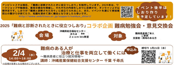 2月4日は、沖縄産業保健総合支援センターより千葉氏をお招きして『難病のある人が治療と仕事を両立して働くには』について勉強会を行います。
